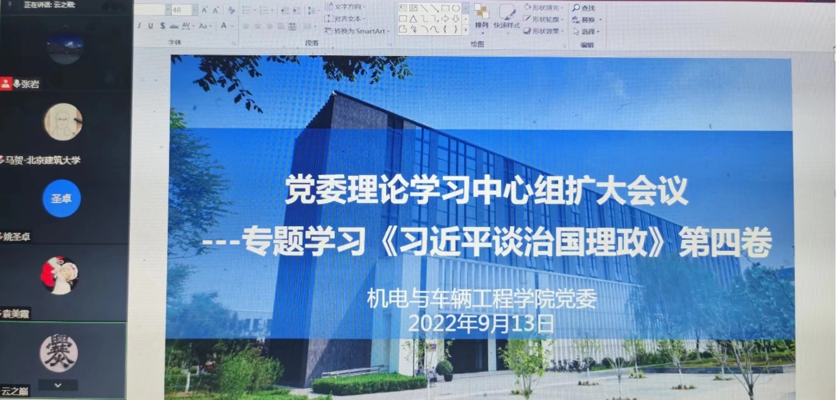 9月13日,指尖四川麻将 召开党委理论学习中心组扩大会议,专题学习《习近平谈治国理政》第四卷,学院班子成员、党委委员、党支部书记参会,会议由党委书记李大伟主持。