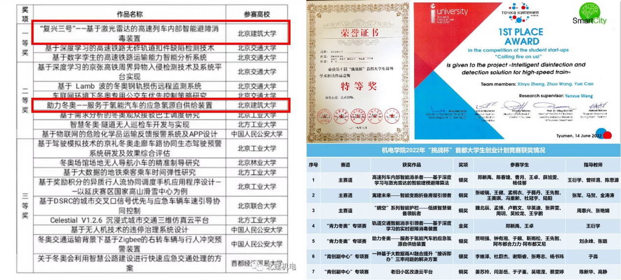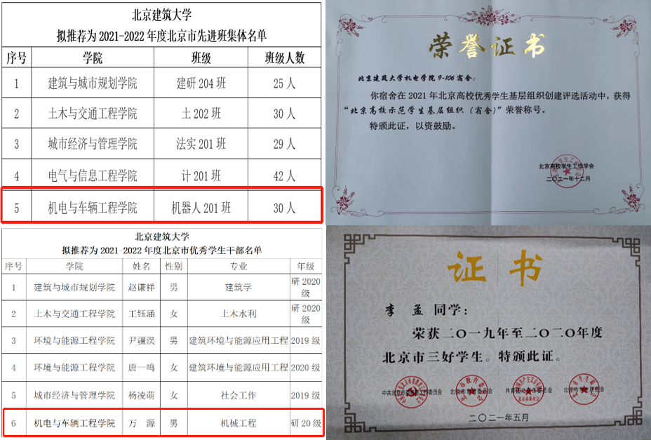 以创新人才培养机制为重点,打造“创新意识-创新能力-创业素质”递进式创新创业培养体系。结合专业优势打通本、研竞赛,坚持“课程、训练、实践、服务”四位一体的育人模式,培育“成长型、阶梯型、服务型”科创实践团队。通过引入创新创业导师持续指导,不断加强学生“双创”意识和能力的培养,推进“专业引路+学涯辅导”落地生根,进一步以赛促学、以赛促教、以赛促改。近五年,学生获全国“挑战杯”三等奖2项,全国大学生机械设计创新大赛二等奖1项,北京市机械设计创新大赛一等奖12项,累计获国际级奖项1项,国家级奖项14项,省部级奖项70余项。