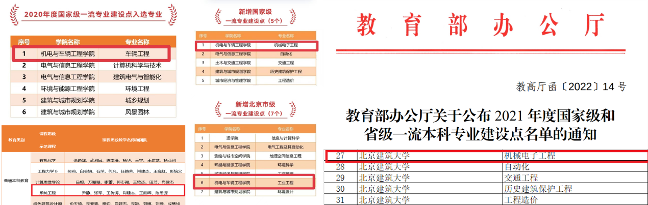 坚持新工科建设,用智能制造引领传统工科专业升级,主动对标新时代高等教育的新要求,认真梳理专业建设情况、加强顶层设计、调整专业结构,以专业认证、审核式评估为抓手,以专业建设质量为核心,持续提升专业内涵建设水平。车辆工程、机械电子工程专业获批获批国家一流专业建设点,车辆工程、机械电子工程、工业工程3个专业获批北京市一流本科专业建设点;2022年,车辆工程专业通过中国工程教育专业认证专家入校考察,机械电子工程专业获中国工程教育认证协会受理认证;获评北京市优质本科课程3门、北京市优质本科教材课件2项。学院与理学院共建课程思政教学研究中心,定期开展交流研讨,不断提升课程思政建设质量,2022年学院获批北京市课程思政示范课程1门。