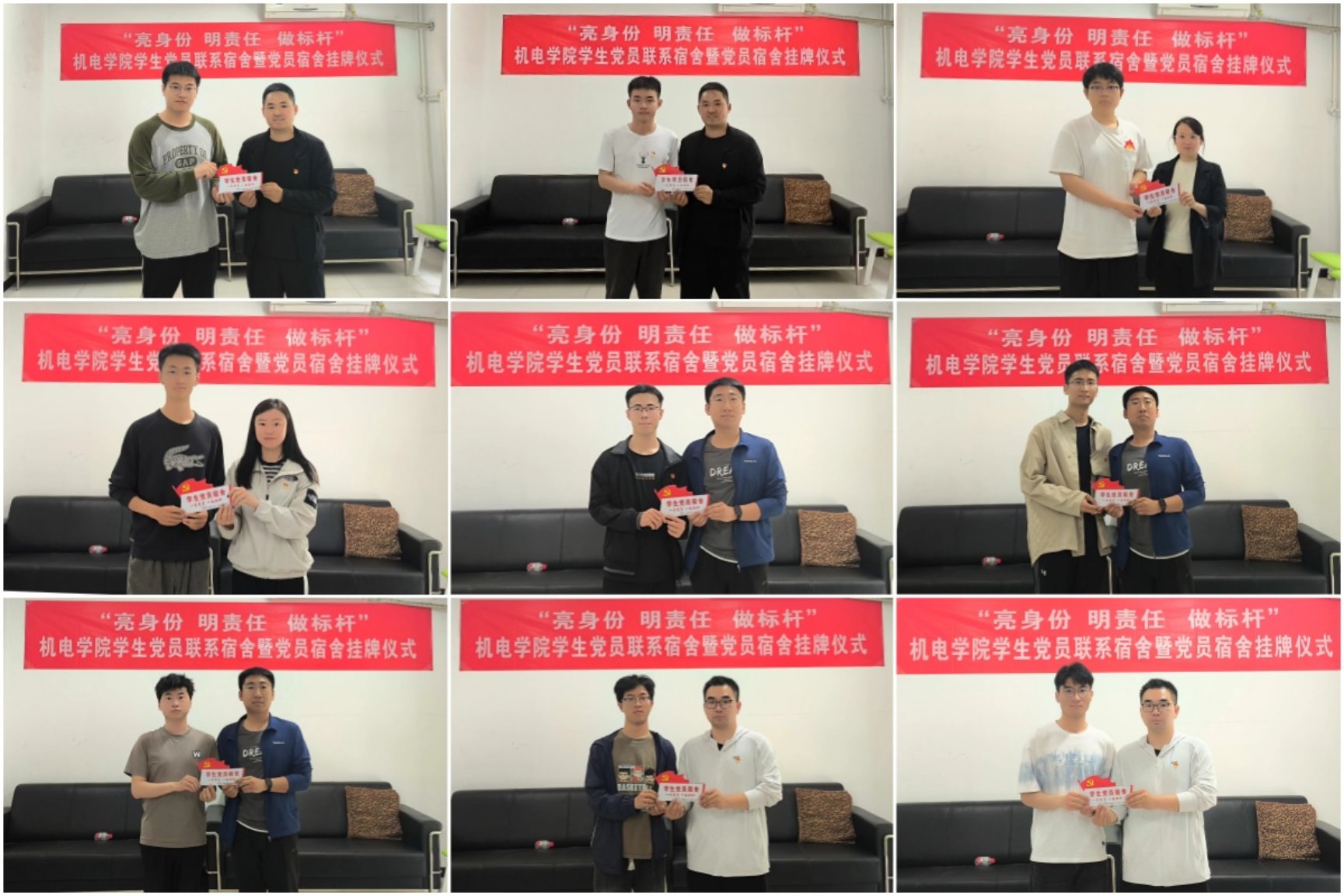 之后,与会老师逐一向党员代表授予“学生党员宿舍”标识牌,并和同学们共同见证党员宿舍挂牌。